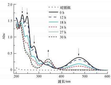 取脫色過程中的樣品, 稀釋5倍進行紫外-可見波譜分析, 結果如圖 6所示.隨著反應的進行, ASA-2在紫外光區227、248 nm處和可見光區475 nm處的特征吸收峰逐漸減弱, 最終完全消失, 這與反應液的顏色由紅色漸變為無色相一致.由此推斷ASA-2蒽醌環結構被破壞, 發色基團發生明顯變化.同時在340 nm處逐漸產生了新的特征吸收峰, 峰值逐漸增大.并且, 在475 nm處的特征吸收峰完全消失時, 340 nm處的峰值達到最大.這一現象說明, 在ASA-2的脫色過程中有產物生成, 且不能夠被菌株GF3利用.