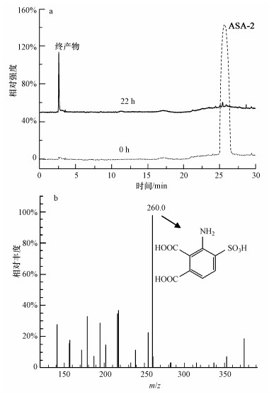 對ASA-2完全脫色后的樣品進行液相色譜-質譜分析, 實驗結果如圖 7所示, ASA-2脫色終產物質荷比為260, 初步推測產物為3-氨基-4-磺酸基鄰苯二甲酸.這與菌株QYY降解ASA-2的終產物不同.并由此推測菌株GF3裂解蒽醌環的方式與以往文獻報道的蒽醌環裂解方式不同.可見, 菌株GF3通過一種新的降解途徑將ASA-2降解.