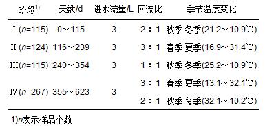 本實驗共運行623 d,分4個階段, Ⅰ為實驗啟動階段, Ⅱ~Ⅳ為穩定運行階段. 實驗運行條件如表 2所示. SBR運行參數:進水 2 min,曝氣和缺氧攪拌反應時間采用DO、 ORP、 pH儀實時控制,靜沉、 硝化上清液回流 30 min,靜沉、 排水30 min. 溶解氧(DO)濃度為1.0~2.5 mg ·L-1, SBR反硝化階段不進行曝氣,只進行缺氧攪拌,因此DO濃度始終小于0.06 mg ·L-1. 污泥濃度(MLSS) 2 500 mg ·L-1,污泥齡(SRT)30 d, 溫度10.4~32.1℃. UASB運行參數為:HRT 1 d, MLSS 20 g ·L-1, SRT 40 d.