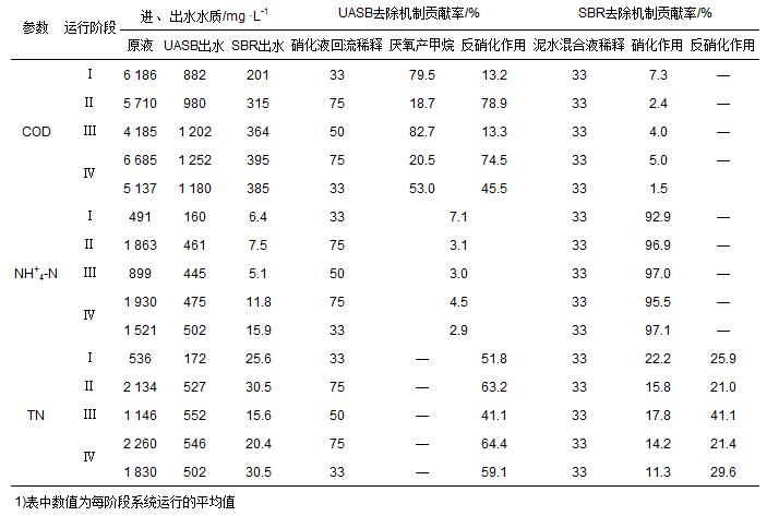 表 3 生化系統UASB和SBR單元的有機物和氮的物料衡算關系1)
