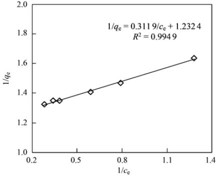 由圖 2和圖 3的吸附等溫線可見,平菇菌糠對銅離子吸附容量qe與平衡濃度ce的雙倒數和平菇菌糠對銅離子吸附容量qe與平衡濃度ce的雙對數均具有線性關系,且擬合結果都很好. Langmuir方程是假設吸附劑表面均勻,各處的吸附能相同; 吸附是單分子層的,當吸附劑表面的吸附質飽和時,其吸附量達到最大值; 在吸附劑表面上吸附的吸附質之間沒有相互作用; 達到動態平衡時,吸附和脫附的速度一樣. 而 Freundlich吸附模型適用于對中等濃度范圍內的吸附現象的描述,對于過低或過高濃度吸附質則不符合實際吸附現象[20]. Chia等[21]也報道,血紅栓菌、 魯氏毛霉等吸附水溶液中鎘離子的吸附等溫線更符合 Langmuir方程,其吸附過程主要為吸附劑表面單層的化學吸附. 從圖 2和圖 3中也可以看出用 Langmuir方程擬合的效果更好,其線性相關系數R2為0.9949. 根據圖 2可以算出 Langmuir方程的參數值: qmax=0.8114 mg ·g-1,b=3.953 L ·mg-1.