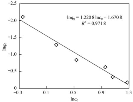 式中,qe為銅離子平衡吸附容量,mg ·g-1; qmax為理論飽和吸附容量,mg ·mg-1; ce為吸附平衡時溶液中銅離子濃度,mg ·L-1; b為Langmuir方程吸附平衡常數,L ·mg-1; k、 n均為Freundlich經驗常數.