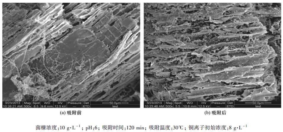 圖 4平菇菌糠吸附前后的掃描電鏡圖Fig.4SEM of native and adsorbed spent substrate of pleurotus oyster