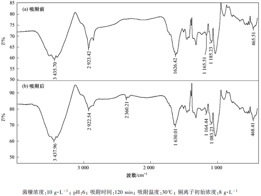 對吸附Cu2+前后平菇菌糠進行FTIR測定,利用OMNIC 8.0紅外光譜處理軟件進行分析,結果如圖6.