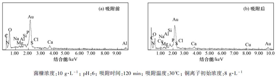 菌糠吸附銅離子之后,菌糠元素成分中出現了少量的銅,初步說明有銅元素附著在吸附劑上. Na、 Mg、 Ca元素都有不同程度的減少,可能在吸附過程中發生離子交換反應,Ngah等[26]也報道過,離子交換是銅離子吸附的機制之一,且 Ca元素減少比例較大,而銅離子又是二價金屬陽離子,故更易與鈣離子發生離子交換[21]; 其中 N、 P也有不同程度減少,初步認為菌糠中的酰胺基、 氨基等基團可能與銅離子發生了表面絡合配位反應.