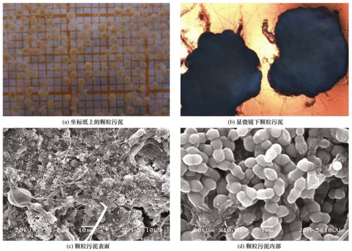 顆粒污泥反應器穩定運行190 d后,污泥顏色為淡黃色,呈近似球形或橢圓形,結構致密[圖3(a)],平均粒徑為1.2 mm; 顆粒邊緣清晰并且附有一定的絲狀物,其中還有一定的原生動物,如鐘蟲、 輪蟲等[圖3(b)]; 顆粒污泥是一個復雜的微生物系統,大量絲狀菌纏繞顆粒污泥表面,球菌和短桿菌分布在絲狀菌周圍[圖3(c)]; 污泥內部有孔隙,孔隙內部也分布著為數較多的球菌和短桿菌[圖3(d)].