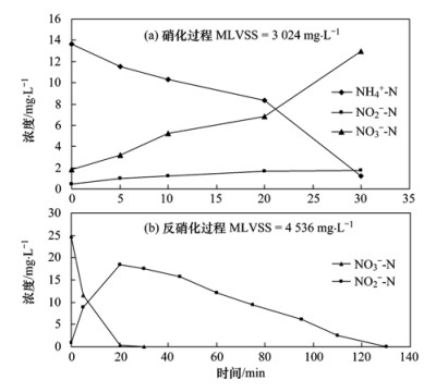 由圖5(a)可以看出,整個硝化反應過程持續30 min,隨著NH+4-N下降,NO-3-N逐漸上升,當NH+4-N含量降低到1.22 mg ·L-1時,NO-3-N達到12.96 mg ·L-1,而NO-2-N在整個硝化過程中,其濃度維持在1.8 mg ·L-1以下,NO-2-N沒有發生積累; 脫氮除磷顆粒污泥最大硝化速率[m(NH+4-N)/m(VSS) ·t]為14.13 mg ·(g ·h)-1,而姜體勝等[24]在同樣條件下,獲得的脫氮除磷絮狀污泥最大硝化速率約為6.25 mg ·(g ·h)-1,本試驗培養的顆粒污泥具有較好的硝化能力.