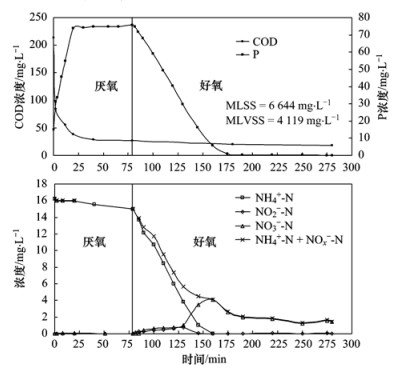 反應器運行190 d時對其某一周期進行監測,得到COD、 NH+4-N、 PO3-4-P、 NO-3-N、 NO-2-N各參數的變化(圖7).