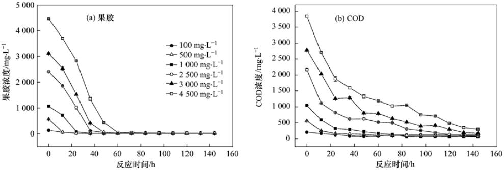 (2)馴化污泥能夠降解初始濃度大于4500 mg ·L-1的果膠廢水.果膠濃度越高,降解速率越快. 果膠濃度為100和500 mg ·L-1時,果膠降解速率分別為4.5和23.1 mg ·(L ·h)-1,而濃度為2500和4500 mg ·L-1的果膠廢水,降解速率分別為49.8和74.0 mg ·(L ·h)-1.果膠初始濃度低于500 mg ·L-1,COD去除率較低,僅為41.6%~82.0%.果膠初始濃度高于1000 mg ·L-1,COD去除率穩定在91%以上.