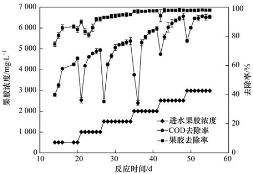 采用人工配水對上述污泥進行馴化, 配水COD為3000 mg ·L-1左右,接種污泥在以葡萄糖為唯一碳源的培養基中培養13 d后,逐步添加果膠進行馴化,添加量分別為:葡萄糖2500 mg ·L-1+果膠500 mg ·L-1,7 d; 葡萄糖2000 mg ·L-1+果膠1000 mg ·L-1,6 d; 葡萄糖1500 mg ·L-1+果膠1500 mg ·L-1,8 d; 葡萄糖1000 mg ·L-1+果膠2000 mg ·L-1,7 d; 葡萄糖500 mg ·L-1+果膠2500 mg ·L-1,7 d; 果膠3000 mg ·L-1,7 d; 當果膠與COD去除率達到90%以上時,說明馴化成功.