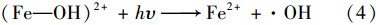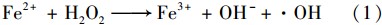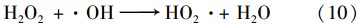 圖 3(d)顯示了Fe2+濃度對(duì)光電Fenton技術(shù)處理污泥脫水液過程中COD去除率的影響. 當(dāng)溶液中沒有Fe2+存在時(shí),僅獲得一個(gè)較低的COD去除率. 說明單獨(dú)在UV作用下,H2 O2分解產(chǎn)生 ·OH的速率較低. 當(dāng)投加FeSO4后,COD去除率有明顯的提高. H2 O2在Fe2+作用下,快速產(chǎn)生 ·OH,污泥脫水液中的有機(jī)物被快速地氧化分解,因而COD去除率提高. 盡管提高Fe2+濃度可以提高COD去除效果,但Fe2+同時(shí)也被 ·OH氧化. 另外,大量產(chǎn)生的 ·OH將和H2 O2反應(yīng)消耗H2 O2[式(10)]. 同時(shí),由于Fe2+濃度的增加,溶液的透明度降低,UV的促進(jìn)作用受到影響,反應(yīng)(1)、 (3)、 (4)受到抑制. 再者,隨著Fe2+濃度的增加也會(huì)形成二次污染問題. 根據(jù)圖 3(d),F(xiàn)e2+的最佳濃度為6.53 mmol ·L-1.