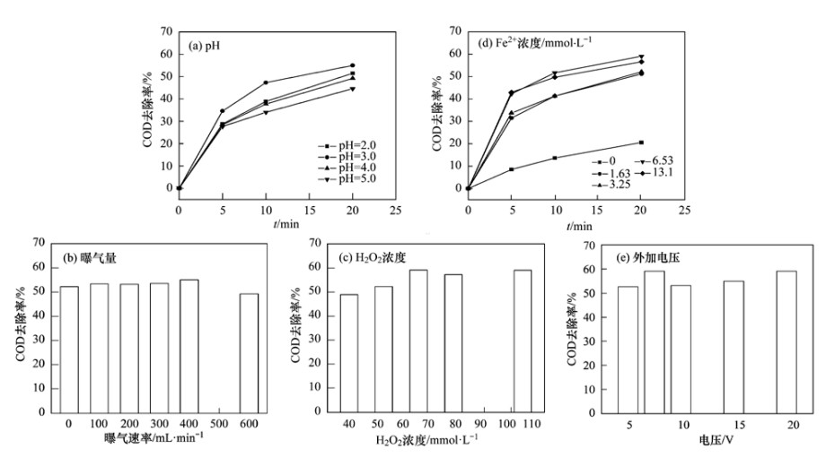 圖 3 pH值、 曝氣量、 H2 O2濃度、 Fe2+濃度、 外加電壓對(duì)COD去除率的影響