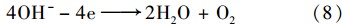圖 3(b)顯示了曝氣速率對(duì)COD去除率的影響. 對(duì)于光電Fenton過程,溶解氧可以從陰極得電子生成H2 O2[式(5)],因此溶解氧濃度會(huì)影響反應(yīng)過程中H2 O2的產(chǎn)量. 在光電Fenton過程中,溶解氧主要通過兩種方式提供,曝氣以及陽極反應(yīng)[式(8)]. 隨著溶解氧濃度的升高,H2 O2的產(chǎn)量也會(huì)增加. 盡管增加曝氣量可以增加溶解氧濃度,但曝氣同時(shí)也會(huì)加速H2 O2的分解生成水,而這對(duì)于利用H2 O2產(chǎn)生 ·OH降解有機(jī)物是不利的. 另外當(dāng)溶解氧濃度較高時(shí),F(xiàn)e2+易被氧化成Fe3+[式(9)],這也會(huì)影響 ·OH的產(chǎn)生,進(jìn)而影響廢水處理效果. 由圖 3(b)可以看出,曝氣對(duì)光電Fenton處理污泥脫水液COD去除率影響較小,因此在后續(xù)試驗(yàn)中停止曝氣.