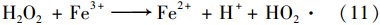 圖 3(c)顯示了H2 O2投加量對(duì)光電Fenton處理污泥脫水液COD去除率的影響. 在該部分試驗(yàn)中,保持n(Fe2+) ∶ n(H2 O2)為1 ∶10. 隨著H2 O2投加量的增加,COD去除率也隨之增大. 主要是由于H2 O2投加量的增加,有更多的 ·OH產(chǎn)生. 但是過多的羥基自由基將和H2 O2反應(yīng)[式(10)][28],同時(shí) ·OH也會(huì)氧化Fe2+,并且Fe3+也會(huì)消耗H2 O2[式(11)]. 這些副反應(yīng)都會(huì)降低H2 O2的利用率. 所以當(dāng)繼續(xù)增加H2 O2的投加量時(shí),COD去除率有所降低. 根據(jù)圖 3(c),H2 O2的最佳投加量為65.3 mmol ·L-1.