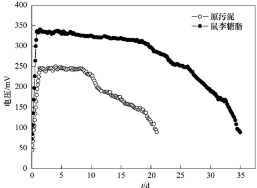 分別記錄對照組和實驗組運行一周期內電壓變化. 如圖 1所示, 未投加鼠李糖脂的對照組, SSMFC經1.5 d運行后電壓迅速上升到250 mV后基本穩定, 持續運行9 d后再緩慢下降至周期結束, 整個周期持續20 d. 而實驗組, SSMFC經0.8 d運行后電壓迅速上升到335 mV,而后穩定運行20 d, 再緩慢下降到100 mV以下, 整個周期持續運行35 d. 系統穩定運行時, 實驗組較對照組SSMFC輸出電壓要高85 mV左右, 持續運行周期要長15 d左右. 因此, 采用鼠李糖脂強化污泥水解可以提高SSMFC的輸出電壓, 延長系統運行周期.