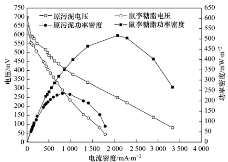 在運行周期內相對穩定時期進行極化曲線研究和輸出功率密度的分析. 由圖 2可知在SSMFC中投加鼠李糖脂后, SSMFC的最大輸出功率密度為516.7 mW ·m-2, 較對照組最大輸出功率密度236.8 mW ·m-2增加了118.2%. 從極化曲線看, 原污泥SSMFC內阻約為263 Ω, 而實驗組SSMFC內阻約為135 Ω. 說明投加鼠李糖脂提高了SSMFC的輸出功率密度, 降低了系統內阻.