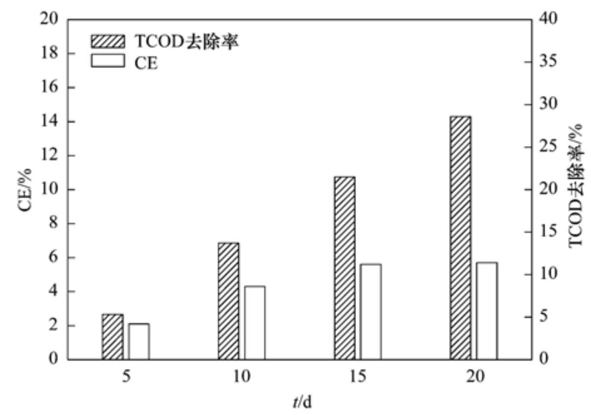 實驗對SSMFC穩定運行周期內污泥的TCOD, 庫侖效率隨SSMFC運行時間的變化進行分析. 如圖 3、 圖 4所示, 隨著SSMFC的運行, 實驗組和對照組的TCOD去除效率均逐漸升高. 運行周期結束時, 對照組TCOD去除效率為28.6%, 實驗組達到58.5%. 對照組和實驗組CE均隨著電池運行逐漸升高,周期結束時對照組CE為5.7%, 實驗組為11.8%.