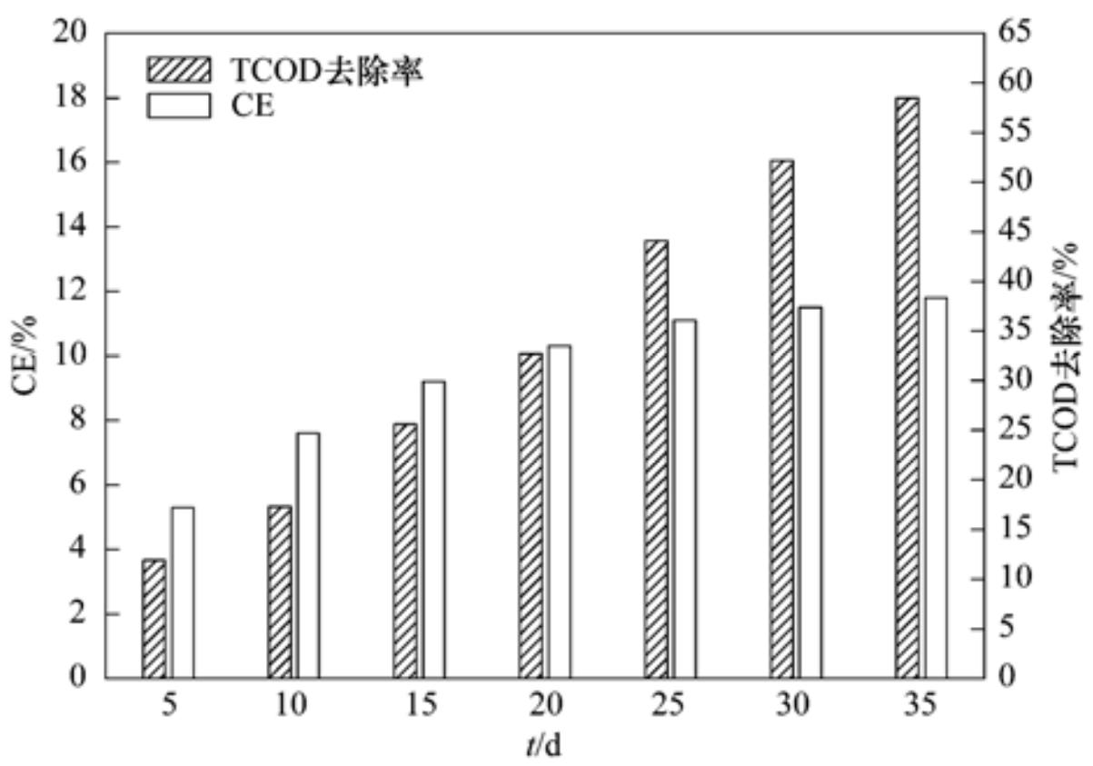 圖 3 原污泥SSMFC TCOD去除率,CE隨運行時間變化