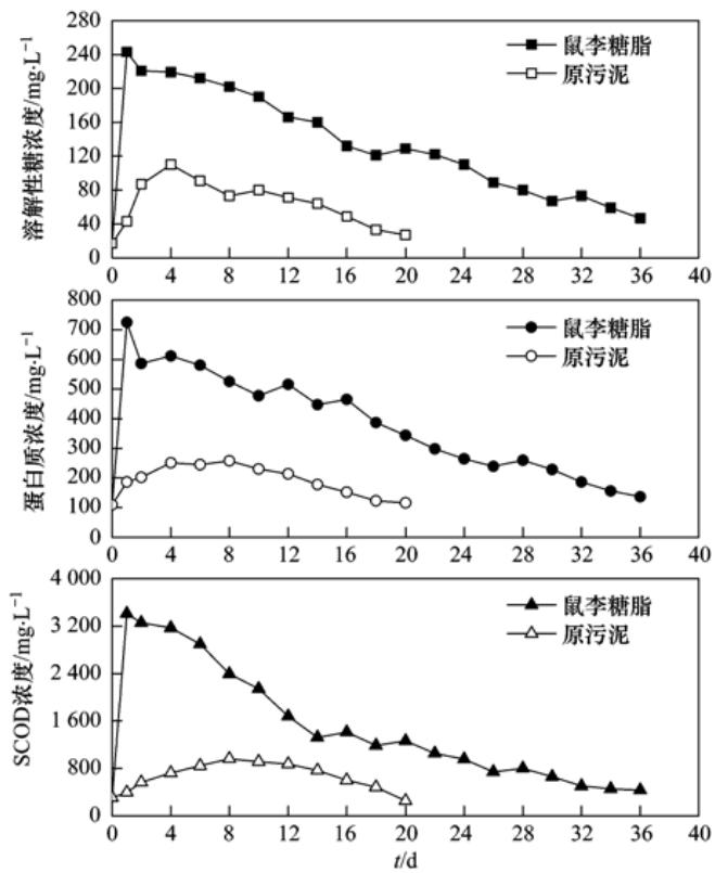 圖 5 SSMFC中污泥SCOD,蛋白質,溶解性糖隨運行時間變化