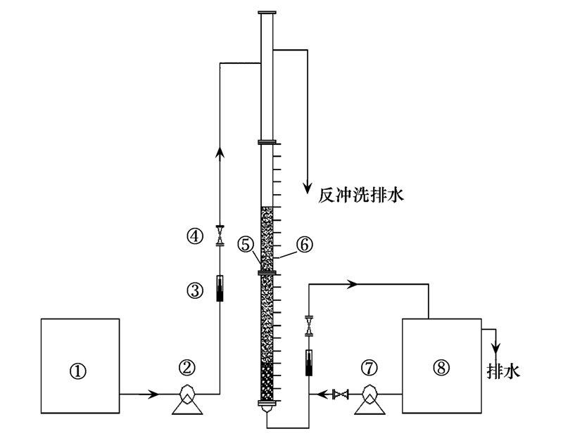 、僭; ②進水泵; ③流量計; ④閥門; ⑤硫酸鹽還原生物濾池; ⑥取樣口; ⑦反沖洗水泵; ⑧反沖洗水箱