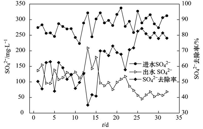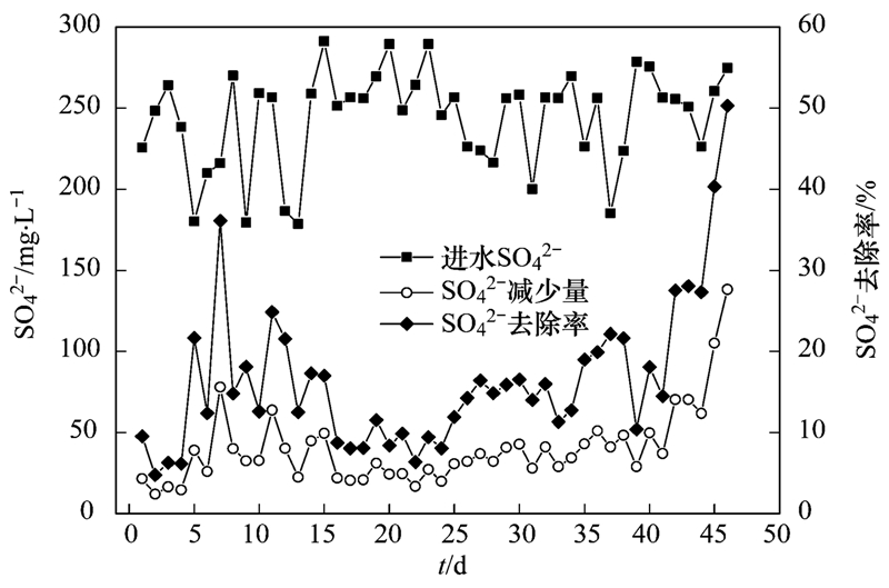 由圖4可知,在生物濾池運行初期,生物濾池對SO2-4的去除率較低,SO2-4的去除量維持在40~50 mg ·L-1.當進水SO2-4為250 mg ·L-1左右時,去除率只有10%~25%.從第41 d起,SRB還原SO2-4逐步增強,去除率也相應提高,生物濾池開始進入穩定期.