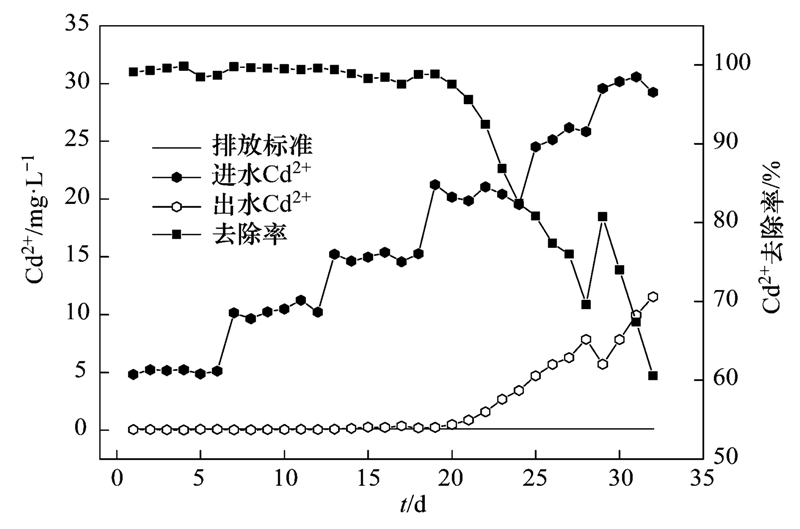 Cd2+濃度的變化會引起Cd2+容積負荷的變化,當Cd2+容積負荷增大到某一值,超過生物濾池對Cd2+的處理能力時,可能出現生物濾池漏Cd2+的現象.由圖5可知,在其他條件不變的前提下,進水Cd2+濃度的增加對于生物濾池對鎘的去除效率有一定的影響.當進水Cd2+≤15 mg ·L-1時,出水Cd2+≤0.1 mg ·L-1,去除率≥99%,出水濃度達到國家《污水排入城鎮下水道水質標準》(CJ 343-2010)中對Cd的排放要求.在進水Cd2+>20 mg ·L-1以后,生物濾池出現了嚴重的漏Cd2+現象,出水中Cd2+濃度從原來的0.1 mg ·L-1以下逐步升高,隨著進水Cd2+濃度的再次增加,出水中Cd2+濃度也逐步升高,若以進、 出水中Cd2+的濃度變化表示生物濾池的除Cd2+能力,則對應的Cd2+的去除量為18.2~20.3 mg ·L-1,去除率也由99%以上下降到60%.雖然隨著進水Cd2+濃度的升高,盡管出水中出現漏Cd2+現象及Cd2+的去除率不斷降低,但Cd2+的絕對去除量可以維持20 mg ·L-1左右,說明該生物濾池對高濃度含Cd2+廢水仍有一定的去除效果.