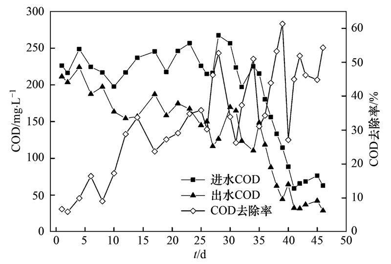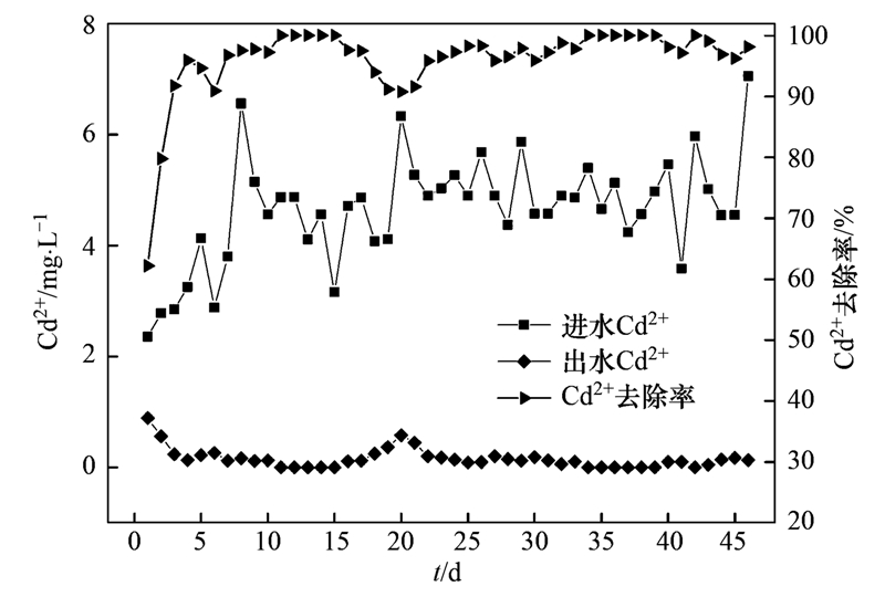 所有檢測項目均采用國家規定的標準方法[19]. Cd2+濃度的檢測采用原子吸收法,檢測儀器為AAS vario 6型原子吸收儀;SO2-4濃度的檢測采用離子色譜法,檢測儀器為IC型離子色譜儀;COD值采用聯華科技的5B-3F型COD 快速測定儀; pH值采用pHS-2C型pH計測定,測定前用標準pH緩沖溶液進行校正;溶解氧(DO):手提式DO測試儀;水溫:手提式DO測試儀. 2 結果與討論 2.1 運行初期生物濾池對Cd2+、 COD及SO2-4的去除效果 首先對SRB進行包埋固定化,并對建立好的生物濾池進行培養馴化,完成后保證生物濾池正常進出水,進水DO≤0.8 mg ·L-1,生物濾池V=0.4 m ·h-1,水力停留時間(HRT)=3 h.生物濾池穩定運行46 d,圖2,圖3,圖4分別為46 d內生物濾池中Cd2+、 COD和SO2-4濃度的變化情況.