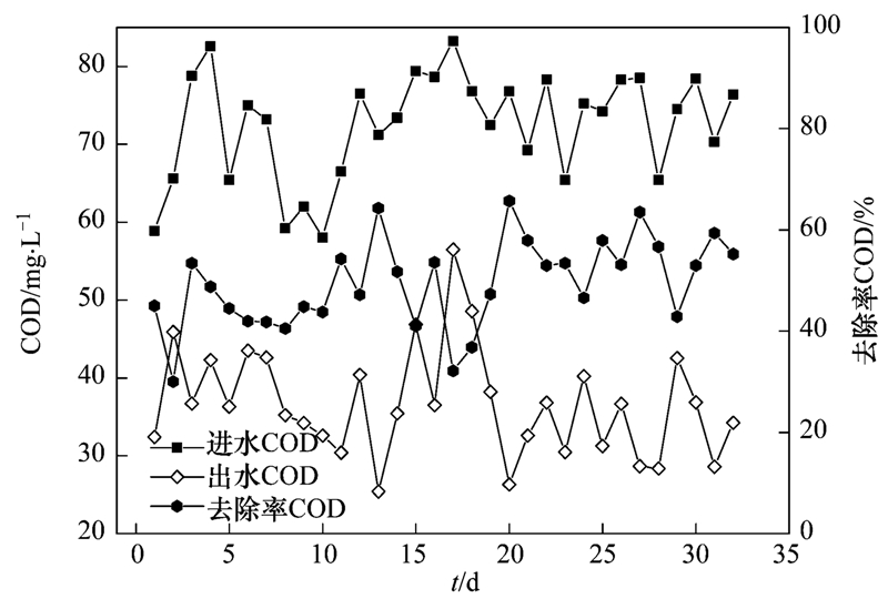 由圖6可知,在連續32 d的穩定運行過程中生物濾池對Cd2+具有良好的去除效果,在進水Cd2+為12.0~14.0 mg ·L-1時,連續32 d對Cd2+的去除率≥99%,出水中Cd2+≤0.1 mg ·L-1,達到國家《污水排入城鎮下水道水質標準》(CJ 343-2010)中對Cd的排放要求.廢水流經生物濾池時,通過濾池中SRB的作用,將SO2-4還原為S2-,同Cd2+結合生成難溶的硫化鎘微絮體,被生物濾料層截留,從而將廢水中的Cd2+去除. 2.3.2 生物濾池對COD的去除效果 廢水中的有機物是SRB能量的主要來源[20,21,22,23],因而廢水中的有機物含量是影響生物濾池性能的重要因素.由圖7所示,生物濾池連續運行32 d,在進水COD為60~80 mg ·L-1的條件下,出水中COD維持在30~40 mg ·L-1.在保證濾池對Cd2+高效去除的前提下,生物濾池中SRB對廢水中COD的去除率在50%以上,說明在此COD的濃度范圍內,可以保證生物濾池內SRB的能量供應及廢水中Cd2+的良好去除. 2.3.3 生物濾池對SO2-4的去除效果