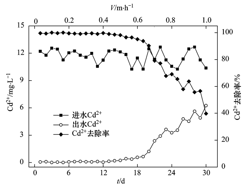 在生物濾池運行初期及穩定期濾速V=0.4 m ·h-1,生物濾池對Cd2+有穩定的去除效果.由圖9可知生物濾池的下半部分濾層未全部發揮作用,生物濾池是一個動態平衡的系統,可以采用提高V的方式增加對生物濾池濾層的利用.在此階段研究V對生物濾池除Cd2+的影響,較低的V有利于Cd2+與S2-的結合及濾池對難溶的金屬硫化物的截留,但生物濾池的處理效率較低,因此合理的V不僅可以保證對Cd2+的良好去除還能提高生物濾池的處理效率[24, 25].由圖10可知,保證進水Cd2+在12 mg ·L-1左右,V<0.6 m ·h-1時,生物濾池對Cd2+有良好的去除效果,但V≥0.8 m ·h-1時,生物濾池出現嚴重漏Cd2+現象,但仍有一定的去除效果.其原因可能是因為較高的V導致Cd2+短時間內不能與生成的S2-有效地結合生成難溶的金屬硫化物,且隨著V的提高,單位容積內S2-的生成量減少,從而造成生物濾柱漏Cd2+.所以在本試驗條件下,V<0.6 m ·h-1時生物濾池對Cd2+有良好的去除且濾池本身也得到充分利用.