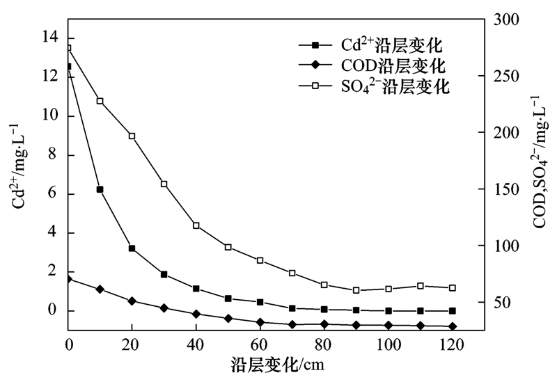(4)在穩定運行期間,濾池沿層對Cd2+、 SO2-4及COD的去除集中在60 cm以上的濾料范圍內,其中對Cd2+、 COD、 SO2-4的去除率分別為96.41%、 54.18%、 68.38%.說明該生物濾池并未完全發揮作用,有更大的處理潛力.