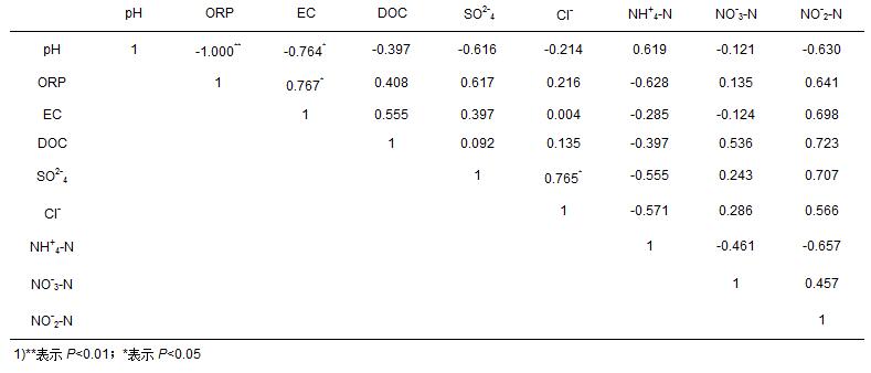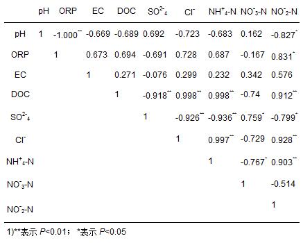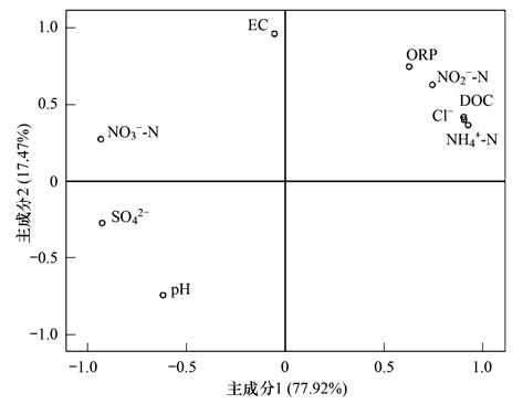表3為填埋場(chǎng)地下水中不同指標(biāo)的相關(guān)分析結(jié)果,結(jié)果顯示,地下水中pH與NO-2-N呈負(fù)相關(guān); ORP與NO-2-N正相關(guān); DOC與Cl-、 NH+4-N、 NO-2-N呈顯著正相關(guān),與SO2-4呈顯著負(fù)相關(guān); SO2-4與Cl-、 NH+4-N、 和NO-2-N呈顯著負(fù)相關(guān), 與NO-3-N呈顯著正相關(guān),Cl-與NH+4-N、 NO-2-N呈顯著正相關(guān),NH+4-N與NO-2-N呈顯著正相關(guān),而與NO-3-N呈顯著負(fù)相關(guān).進(jìn)一步將數(shù)據(jù)進(jìn)行主成分分析(圖 3),可以看到,各指標(biāo)在各象限聚合為三類,ORP、 DOC、 Cl-、 NH+4-N、 NO-2-N等正相關(guān)較為顯著的指標(biāo),在第一象限聚合為一類,與之呈負(fù)相關(guān)的指標(biāo)pH、 SO2-4在第三象限聚為一類,SO2-4與NO-2-N位于三、 四象限的相對(duì)位置顯示出二者間的負(fù)相關(guān)關(guān)系,而EC離各指標(biāo)距離均較遠(yuǎn),它與各指標(biāo)的相關(guān)性均不強(qiáng).上述相關(guān)性分析和聚類分析結(jié)果顯示,與填埋垃圾浸提液不同,地下水中大部分指標(biāo)相關(guān)性較好,預(yù)示其中各污染物具有相似的來(lái)源.