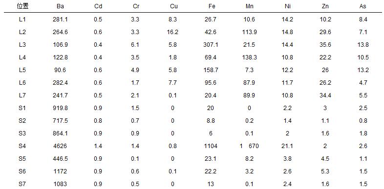 表4 顯示,垃圾浸提液和地下水中Ba含量在所研究金屬中濃度是最高的,垃圾浸提液為90.6~282.4 μg ·L-1,地下水中分布在446.5~4626 μg ·L-1范圍內(nèi),以填埋場(chǎng)所在點(diǎn)地下水中濃度最高(4626 μg ·L-1),為其他地下水采樣點(diǎn)的3倍,所研究填埋場(chǎng)為非正規(guī)填埋場(chǎng),填埋的廢物包括生活垃圾和建筑垃圾,填埋垃圾浸提液與地下水中Ba含量較高,暗示著填埋廢物中含有大量的含Ba化合物.與Ba的分布特征類似的還有除Zn之外的其他重金屬,均是填埋場(chǎng)所在點(diǎn)地下水中的含量超過(guò)其他點(diǎn)地下水中的含量,超標(biāo)倍數(shù)最大的是Fe和Mn,分別超標(biāo)47和203倍.土壤中某些重金屬如Mn的含量很高,在本身就Fe、 Mn含量很高的滲濾液淋溶下,易造成地下水鐵錳污染[19].