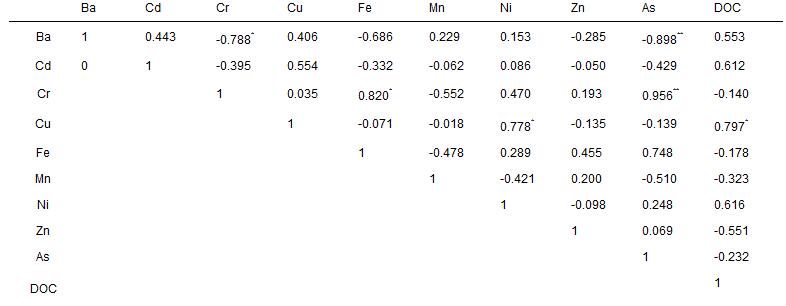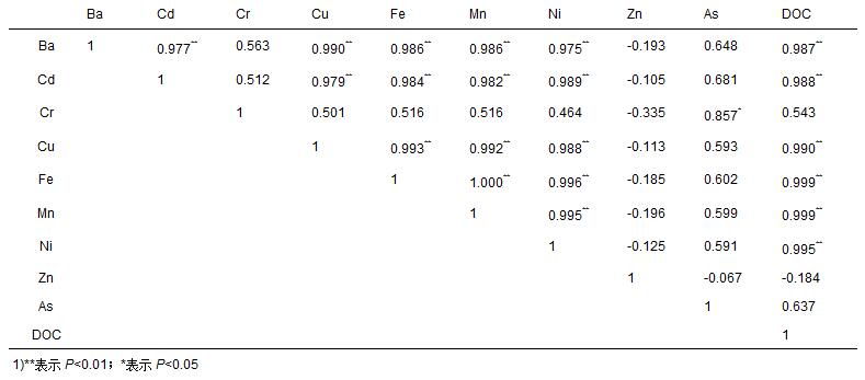 表6顯示,地下水中除Cr、 Zn及As外,其他重金屬之間均顯著正相關(guān),并且它們的含量都與DOC均達(dá)到顯著正相關(guān),說(shuō)明地下水中Ba、 Cd、 Cu、 Fe、 Mn、 Ni來(lái)源相同,并且其分布與DOC有關(guān).Jensen等[6]對(duì)受滲濾液污染地下水的研究顯示,地下水中Cd、 Ni、 Cu、 Pb主要絡(luò)合在DOC上,而Zn主要以無(wú)機(jī)化合物的形式存在,本研究也顯示Zn與DOC未達(dá)到顯著相關(guān).與填埋垃圾浸提液類似,地下水中Cr與As含量也達(dá)到顯著相關(guān),顯示二者可能具有相似的來(lái)源.