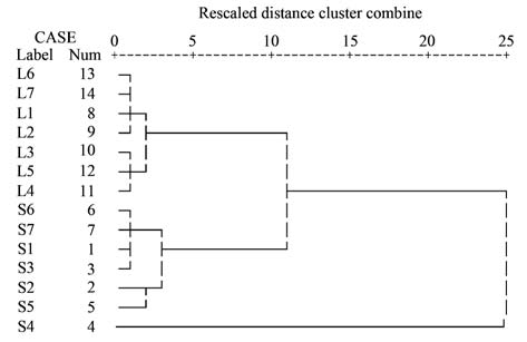 在第一類中,填埋垃圾浸提液L1、 L2、 L6、 L7聚為一小類,而剩余填埋垃圾浸提液樣品聚為另一類; 而在第二類中,上游點(diǎn)S5和下游點(diǎn)S2聚為一類,而其他點(diǎn)(S1、 S3、 S6、 S7)聚為一類.上述結(jié)果顯示,采用聚類分析,可以區(qū)分出污染泄漏點(diǎn)S4,但對(duì)于污染泄漏到一定距離的上下游,區(qū)分度不是很好,這可能與地下水具有較大的緩沖能力,污染組分在其中很快發(fā)生降解和吸附等有關(guān)[4].具體參見(jiàn)污水寶商城資料或http://www.bnynw.com更多相關(guān)技術(shù)文檔。