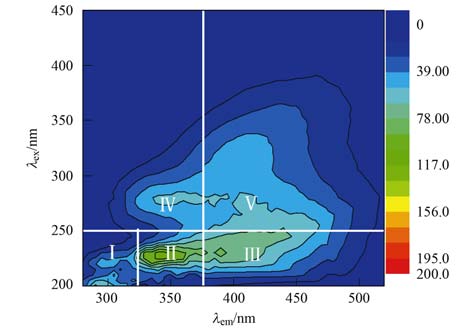 DOM的三維熒光光譜區(qū)域體積積分分析法參照Chen等[15]的報(bào)道進(jìn)行,將DOM的三維熒光光譜圖分為5個(gè)區(qū)域(圖1):Ⅰ、Ⅱ、Ⅲ、Ⅳ及Ⅴ(圖2). 區(qū)Ⅰ和區(qū)Ⅱ激發(fā)波長(zhǎng)/發(fā)射波長(zhǎng)分別為200~250/280~325 nm、 200~250/325~375 nm,區(qū)Ⅲ激發(fā)/發(fā)射波長(zhǎng)范圍為200~250/375~520 nm,區(qū)Ⅳ和區(qū)Ⅴ激發(fā)/發(fā)射波長(zhǎng)范圍依次為>250/280~375 nm和>250/375~520 nm,計(jì)算各區(qū)區(qū)域體積.