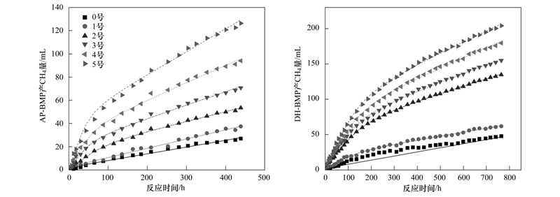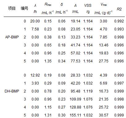 AP-BMP、 DH-BMP批次實驗持續時間分別為439 h、 765 h,6組不同的投配比設計累積產氣量存在著明顯的差異.實驗初期累積產氣量差異不明顯(圖1),后期逐步增大.兩組實驗氣體成分均以CH4(80%)、 CO2(20%)為主,同時存在少量的H2(不足1%).實驗產氣均勻,可分為兩個階段.第一階段產氣速率大,產甲烷菌利用溶解性COD或易水解性物質進行厭氧發酵; 之后產氣速率逐漸降低至穩定水平,該階段的限速步驟為剩余污泥的水解過程,產氣隨著水解的進程而穩定增加.至該實驗結束時,每天仍有穩定體積的氣體產生,表明微生物的水解、 厭氧產CH4仍在進行中.應用改進的Gompertz模型對AP-BMP、 DH-BMP產氣進行回歸后的參數如表2所示.兩廠的厭氧污泥產氣數據與改進的Gompertz模型擬合較好(R2>0.99).通常厭氧消化過程中的限速步驟為水解破壁過程[21, 22],在無添加外來基質的0號樣品中,AP、 DH厭氧污泥的遲滯期分別為20.00 h、 12.93 h,表明DH厭氧污泥的活性較高.