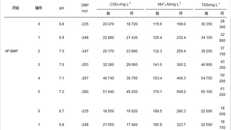 常規水質指標,包括pH(Suntex Ion Analyzer 3000A)、 TSS(Sartorius Analytic oven)、 NH+4-N(Autotitrator AT-400KYOTO)、 TKN(Autotitrator AT-400KYOTO)、 COD(回流加熱滴定)等,均依照美國EPA規定的Standard Methods[18]規定進行.實驗過程中氣體成分(CH4、 CO2和H2)的測量采用氣相色譜(China Chromatography GC8900T)進行.