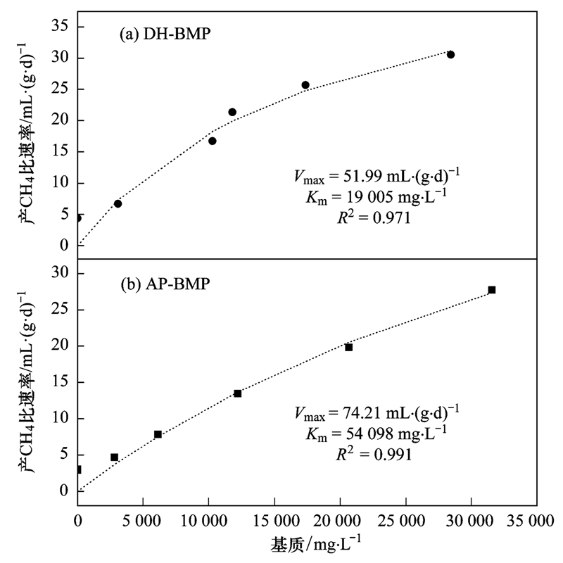 采樣Michaelis-Menten模型對兩個批次實驗的基質濃度、 比產氣速率回歸后的結果如圖2所示(R2>0.99).AP、 DH厭氧污泥的最大比產氣速率差距不大,分別為74.21、 51.99 mL ·(g ·d)-1,但兩廠厭氧污泥的Km存在著顯著的差異,DH厭氧污泥的Km為19 005 mg ·L-1而AP厭氧污泥的Km高達54 098 mg ·L-1.Km是表征底物親和力的常數,表明AP厭氧污泥對該廠剩余污泥的適應性差,需要在較高的基質濃度下才能表現出較好的產CH4性能.