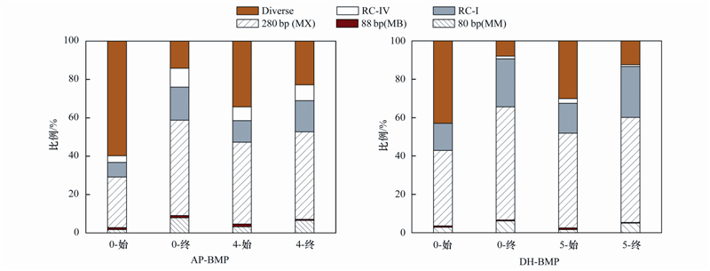 (3)兩批次實驗前后T-RFLP分析結果與其生化產CH4勢相一致,實驗結束后雜菌(Diverse)相對含量顯著下降,產甲烷髦毛菌Methanosaeta spp.(280 bps)、 產甲烷微菌 Methanomicrobiaceae(80 bps)和RC-I(389 bps)的相對含量皆有所提高,且DH-BMP樣品中產甲烷功能菌群相對含量提升程度高于AP-BMP.