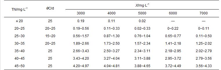 (5)進(jìn)水TN與進(jìn)水COD同步增減,TN≤ 20 mg ·L-1時,污泥齡θC取25 d,進(jìn)水20 mg ·L-1≤ TN<30 mg ·L-1時,θC取15~20 d; 當(dāng)進(jìn)水TN≥ 30 mg ·L-1時(尤其當(dāng)TN≥ 35 mg ·L-1時,此時進(jìn)水溫度較低,一般在15℃以下,生物活性顯著降低),θC取20~25 d.