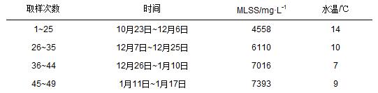 2012年10月19日~2013年1月16日期間,進(jìn)水水質(zhì)指標(biāo)平均值如下:COD 275.4mg ·L-1,SS 265.5mg ·L-1,TN 34.1mg ·L-1,NH+4-N 16.2mg ·L-1,NO-3-N 1.0mg ·L-1,TP 5.1mg ·L-1,水溫 5~15℃之間.該工況共運(yùn)行90 d,其運(yùn)行參數(shù)為:污泥回流比100%,混合液回流比100%,生物反應(yīng)池平均MLSS為7000 mg ·L-1,MLVSS/MLSS比值約為0.48,污泥齡為23.5 d.