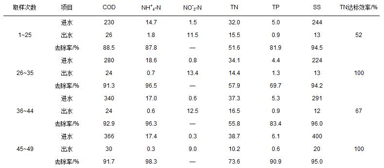 工況一:進(jìn)水TN在25mg ·L-1以下,水溫一般較高,此時可取MLSS在3000mg·L-1左右,污泥回流比為50%,硝化液回流比為0.