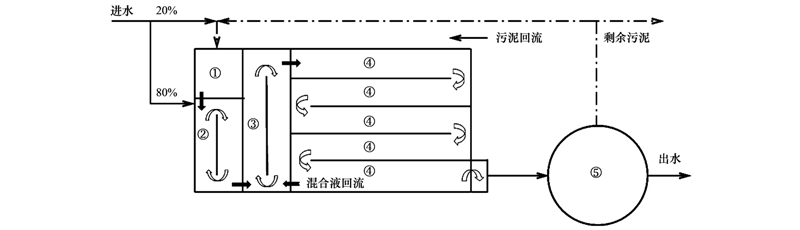 ①選擇池(HRT=0.625 h); ②厭氧池(HRT=1.25 h); ③缺氧池(HRT=1.875 h); ④好氧池(HRT=6.875 h); ⑤二沉池(HRT=2.5 h)