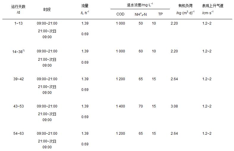運(yùn)行過(guò)程中根據(jù)反應(yīng)器對(duì)污染物的去除效果而改變COD、 NH+4-N、 TP的濃度,具體見表 2.