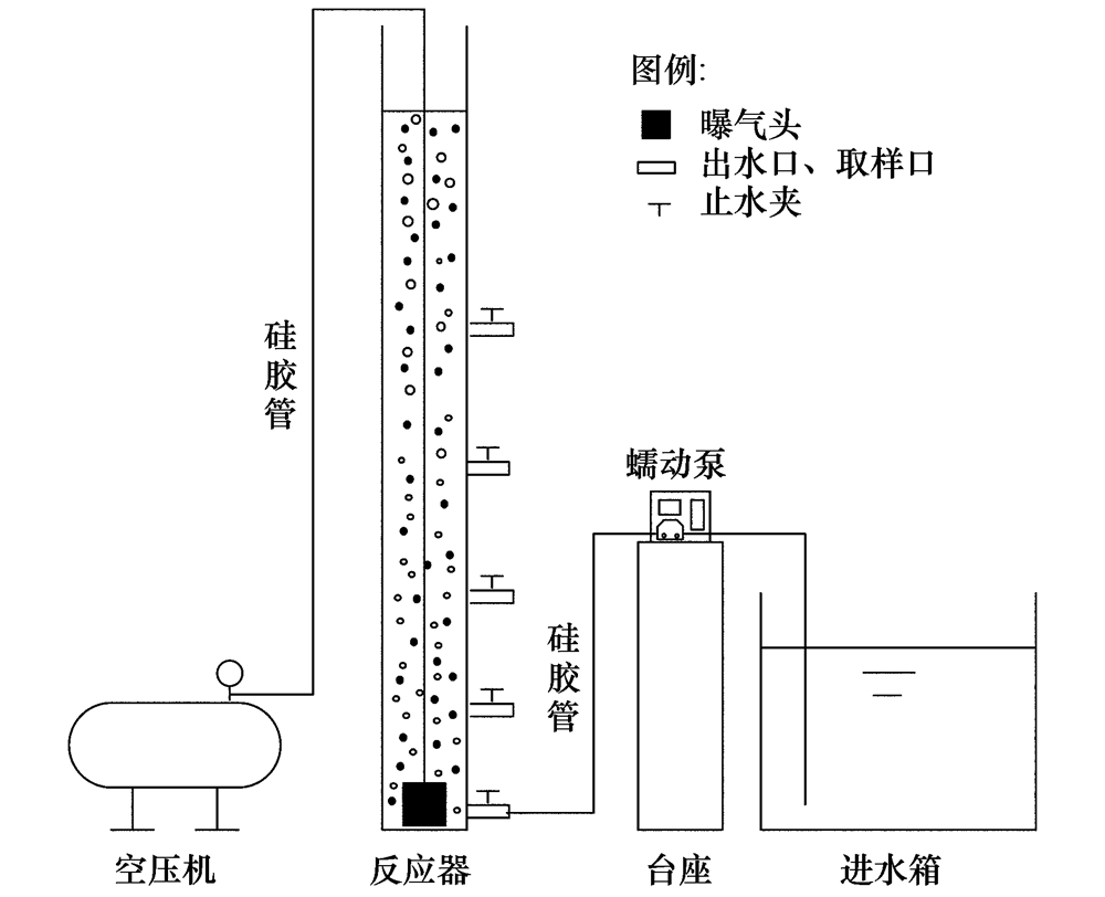 反應(yīng)器總高度2.3 m,內(nèi)徑8.4 cm,有效容積11.64 L(有效高度2.1 m),排水口距底座高度54 cm(換水率74.3%). 模擬污水由蠕動(dòng)泵從反應(yīng)器底部引入(進(jìn)水口距底部高4 cm),壓縮空氣由空壓機(jī)提供,經(jīng)硅膠管后由曝氣砂頭從反應(yīng)器底部壓入. 試驗(yàn)裝置見圖 1所示.