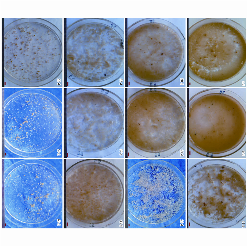 圖 3 好氧顆粒污泥形態(tài)變化數(shù)碼照片
