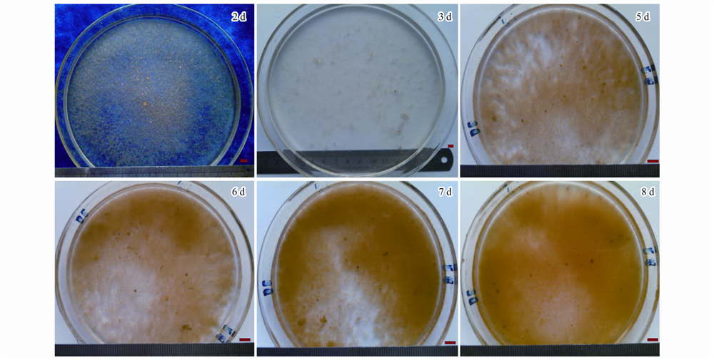 接種5 L化糞池污水和500 mL序批式好氧顆粒污泥反應(yīng)器(AGSBR)出水,連續(xù)曝氣1 d后采用SBR運(yùn)行模式(6 h ·周期-1,4個(gè)周期 ·d-1),COD從500mg ·L-1逐漸增至800mg ·L-1,第2 d時(shí)反應(yīng)器內(nèi)即出現(xiàn)了細(xì)小的生物絮體,并夾雜著少量好氧顆粒污泥(SBR中排出的解體顆粒). 運(yùn)行8 d后培養(yǎng)出沉降性能良好的活性污泥,顏色主要為黃色. 反應(yīng)器污泥濃度達(dá)到2 558 mg ·L-1,SVI 30.11mL ·g-1,MLVSS/MLSS為0.45. 活性污泥的形成過(guò)程見圖 2.