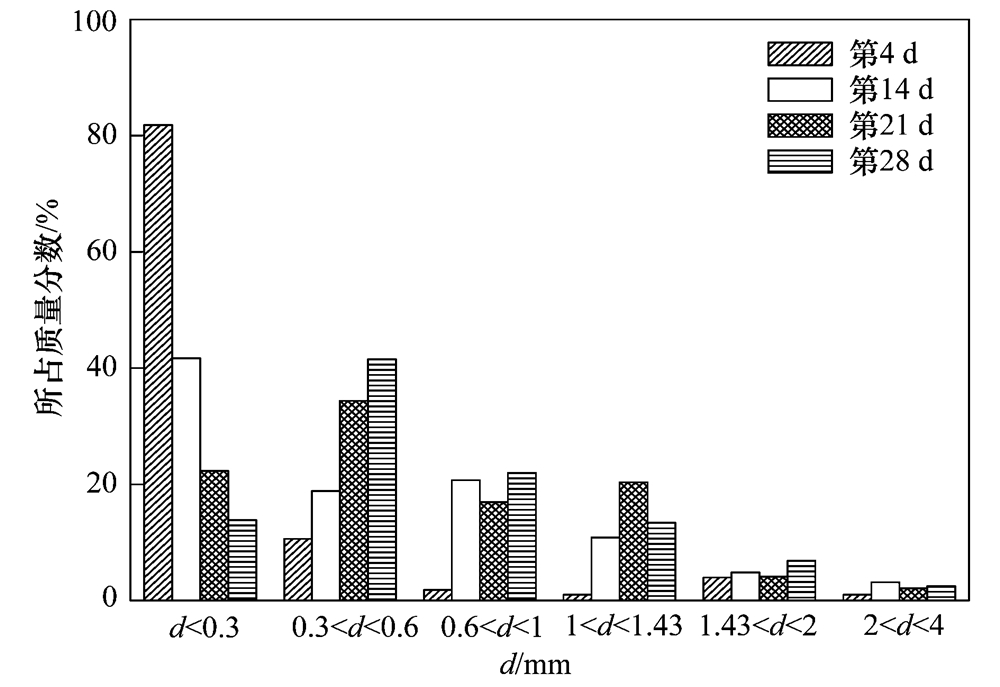 反應(yīng)器內(nèi)污泥的粒徑分布見圖 5所示. 從中可知,隨著逐漸縮短沉降時(shí)間,反應(yīng)器內(nèi)污泥的粒徑逐漸增大,4、 14、 21、 28 d時(shí)對(duì)應(yīng)的平均粒徑分別為:0.19、 0.43、 0.54及0.56 mm. 同時(shí),粒徑小于0.3 mm的污泥的比例逐漸減少,反應(yīng)器的顆;手饾u增大,可以看到污泥的顆粒化率由初期的18.17%上升到86.12%,但0.3~0.6 mm內(nèi)AGS始終占主導(dǎo),這可能與SFBR中較低的底物傳質(zhì)梯度有關(guān),粒徑大的AGS內(nèi)部難以得到基質(zhì)而極易解體. 隨后由于污泥量減少及沉降性能變差,未進(jìn)行粒徑分析.