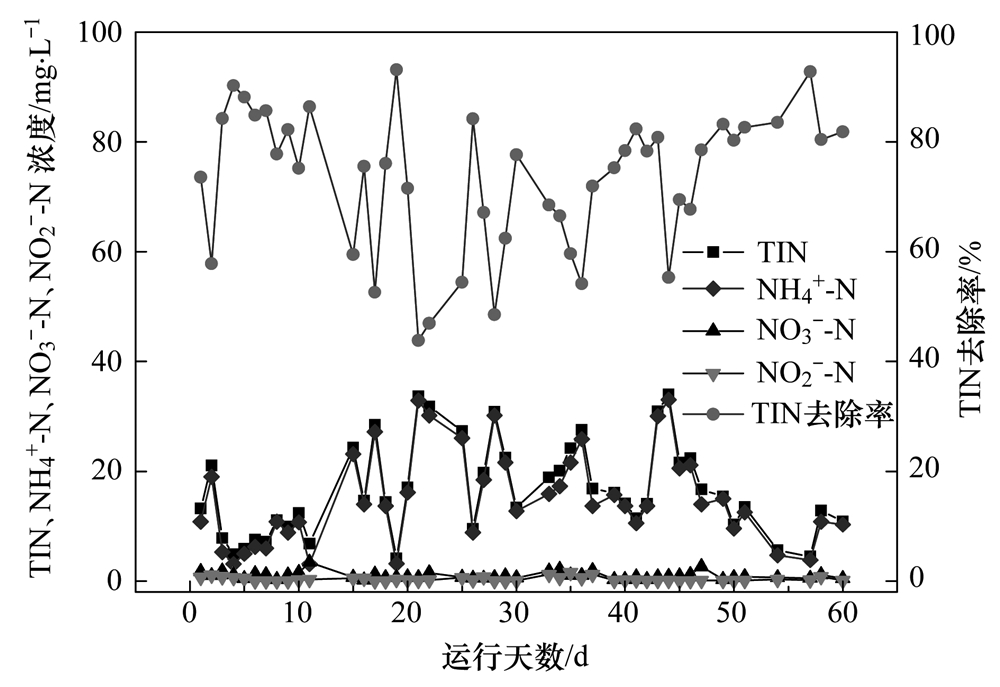 各態(tài)氮的濃度變化及TIN去除率見圖 7. 可以看出,反應(yīng)器對(duì)NH+4-N、 TIN的去除效果波動(dòng)較大,去除率分別為44.45%~94.72%及43.87%~93.13%. 分析原因:一是改變氮負(fù)荷時(shí)會(huì)有短暫的不適應(yīng),此時(shí)的脫氮效率較差; 二是連續(xù)進(jìn)料使得部分NH+4-N未被氧化即排出反應(yīng)器. 從圖 7中還可以看出,出水中NO-3-N濃度絕大部分時(shí)間均高于NO-2-N濃度,但也并未出現(xiàn)明顯的NO-3-N、 NO-2-N積累,分析可能是AGS的內(nèi)部分層結(jié)構(gòu)發(fā)生了同步硝化反硝化作用,而連續(xù)進(jìn)料為反硝化提供了所需的碳源.