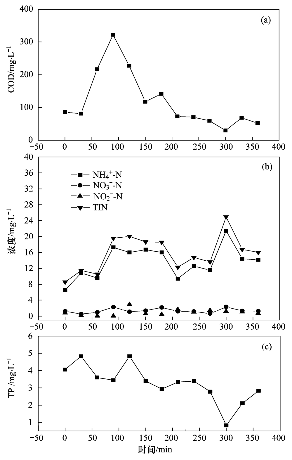 圖 9 典型周期COD、 NH+4-N及TP降解規(guī)律